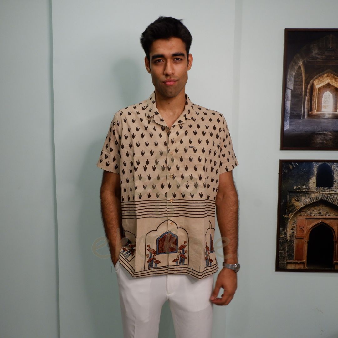 - Ajrakh Panel Print: Hand-blocked Ajrakh prints adorn the shirt in a striking beige and black colorway. These intricate geometric and floral motifs, created using natural dyes, are a true conversation starter.