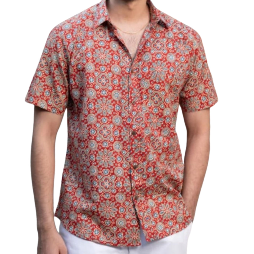 Make a statement with this red Ajrakh print shirt. The intricate Ajrakh motifs, crafted using natural dyes and resist block printing techniques, adorn a base of soft, breathable cotton. This unique shirt is perfect for adding a touch of cultural flair to your wardrobe. Dress it down with jeans for a relaxed weekend vibe, or elevate your look with chinos and dress shoes."