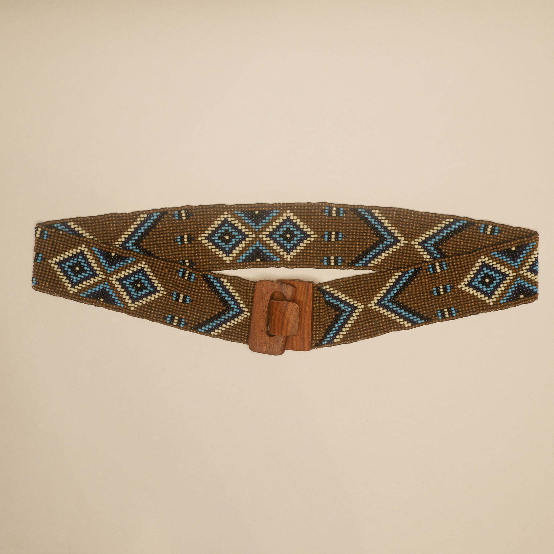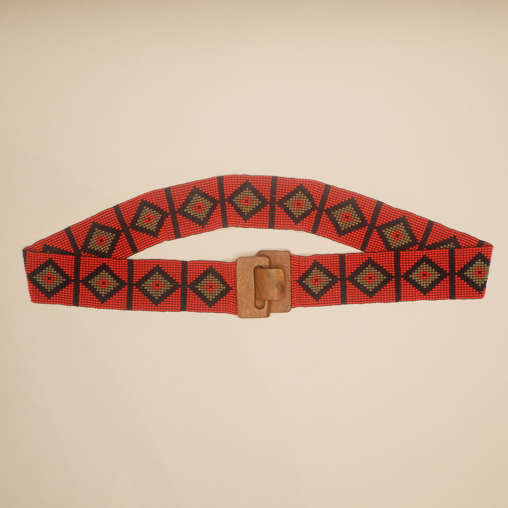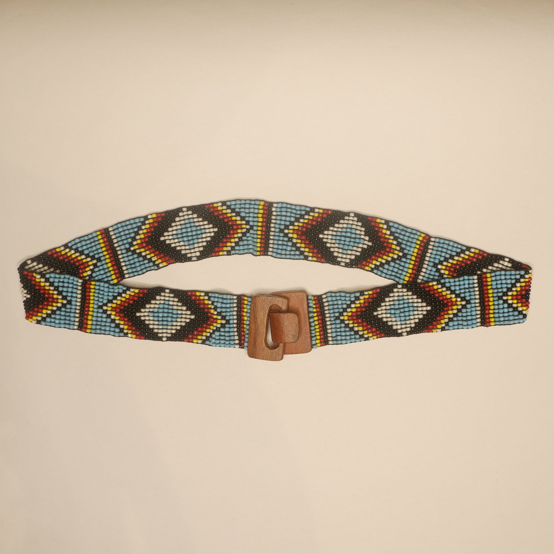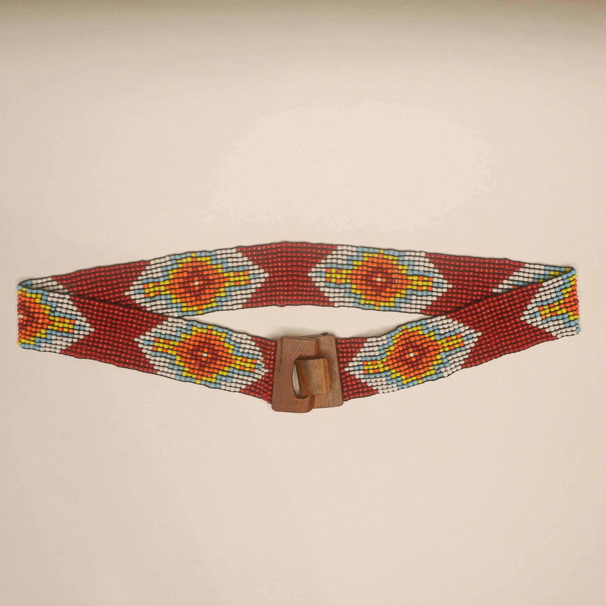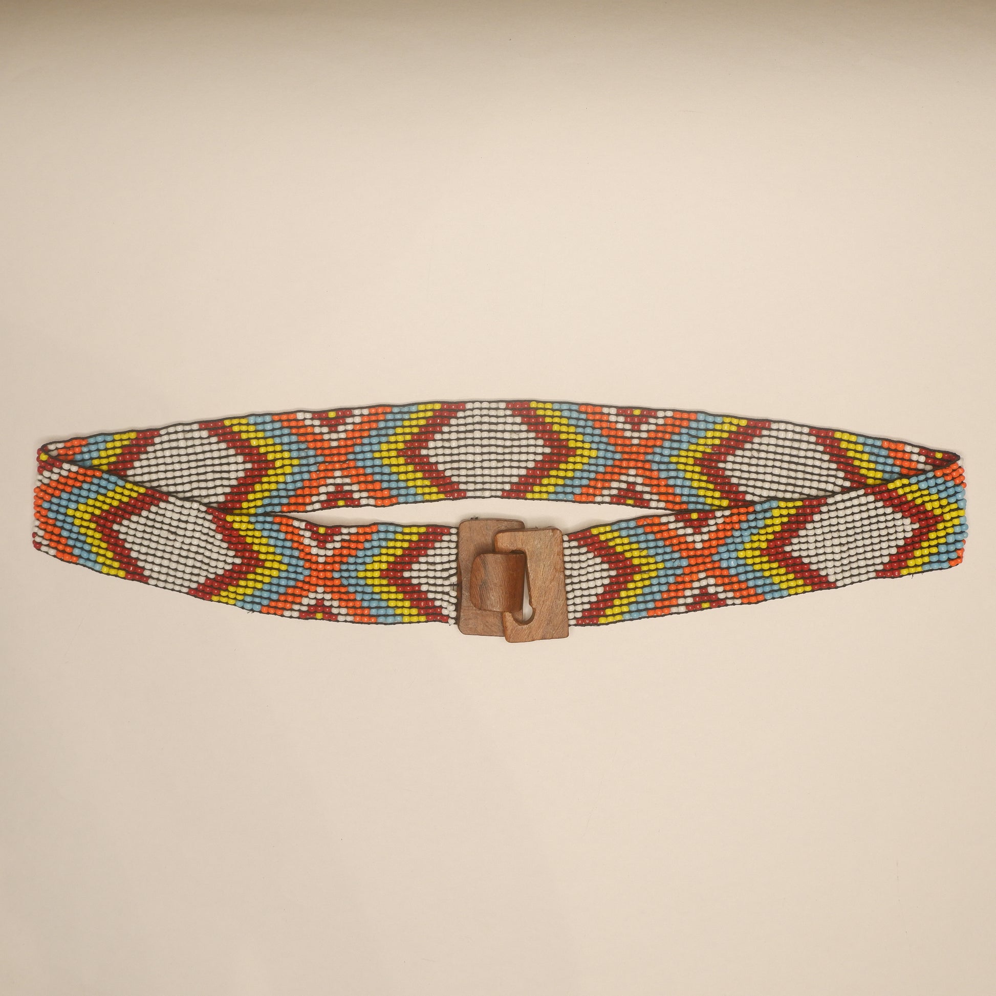 These coloured glass-bead belts are exquisitely handcrafted for Ekobae by our women artisans. These are 4cm (1.5″) wide & can fit waist-sizes from 26″ to 44″ easily as they are made using an elastic thread. The buckle is wooden.