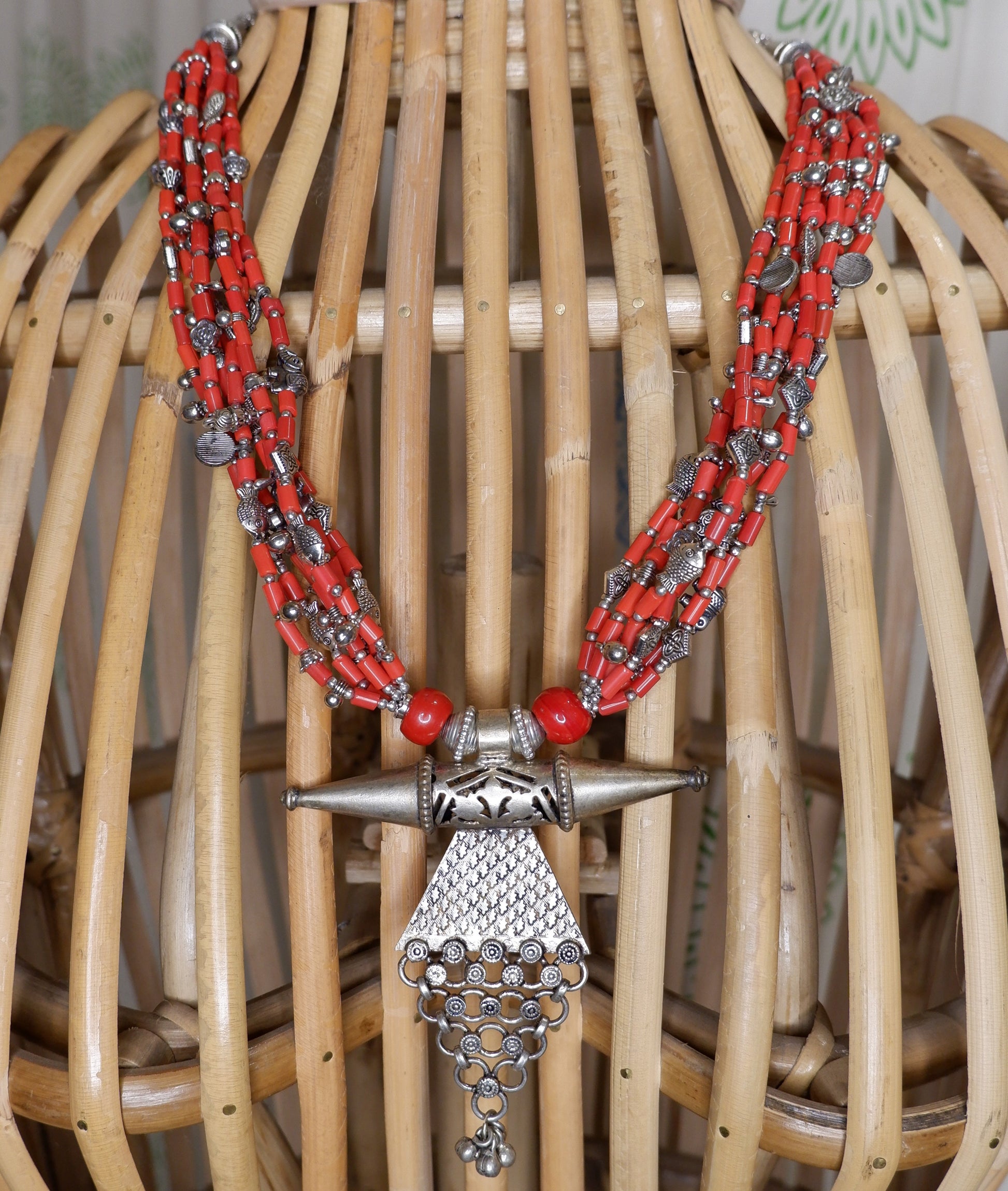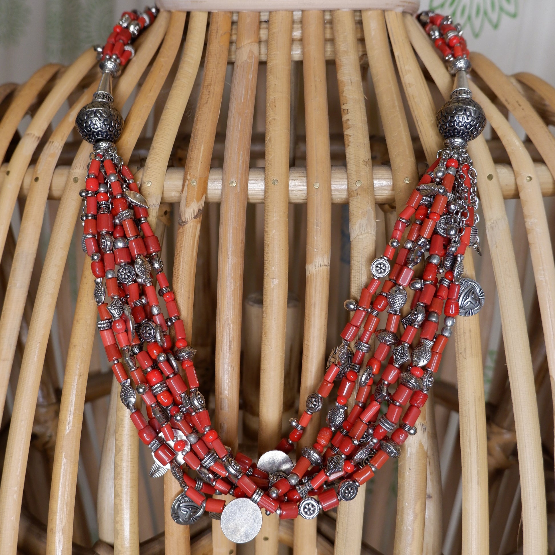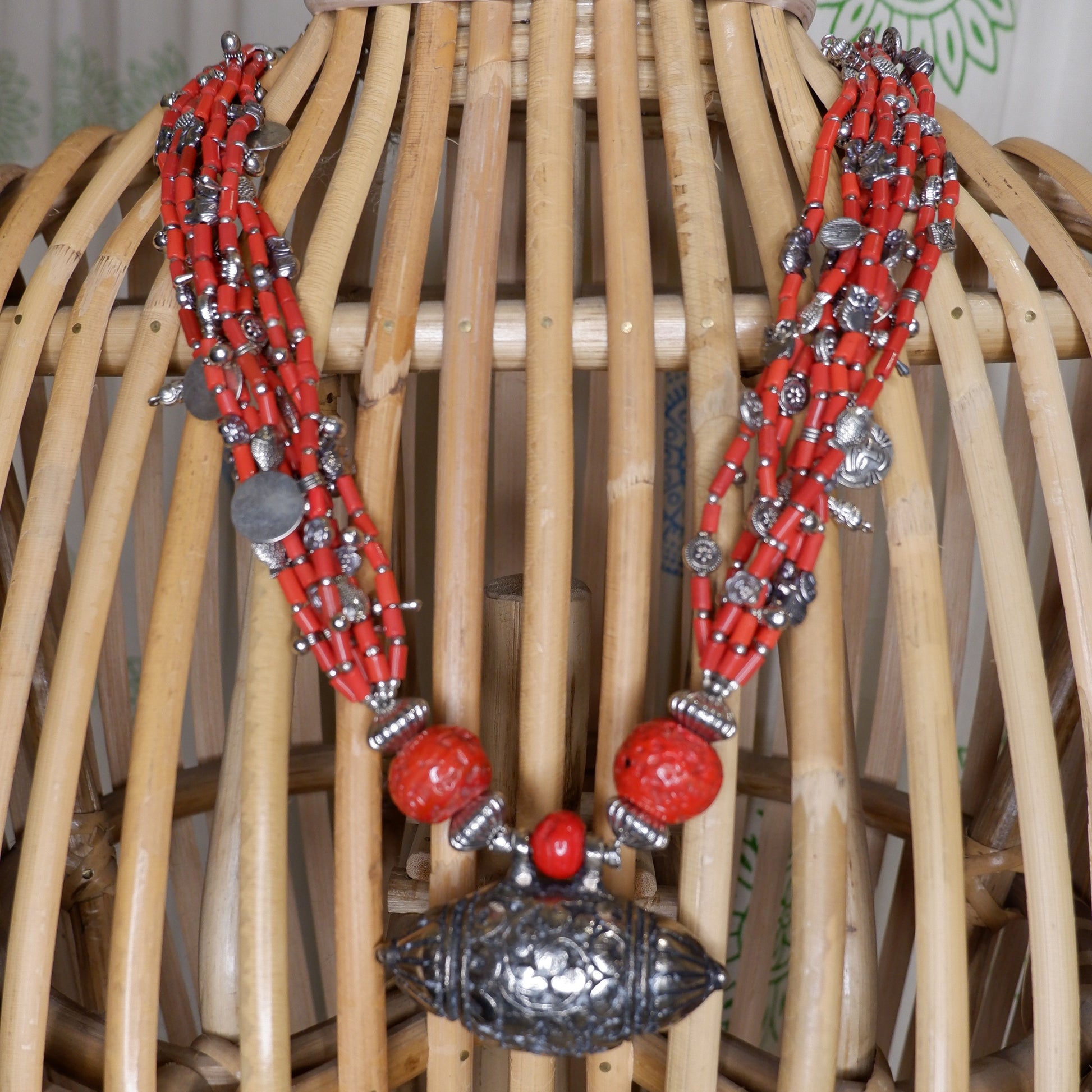 These neckpieces combine Greek jewellery traditions with Indian tribal bead-jewellery.