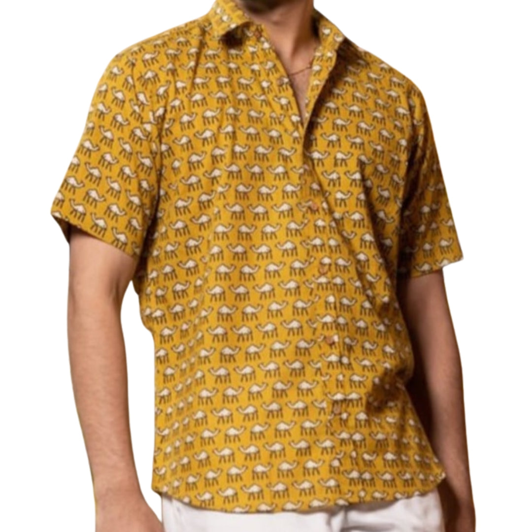 This eye-catching shirt features a sunny mustard yellow base adorned with a camel print, created using the traditional screen block printing technique. Made from soft, breathable cotton, it's perfect for adding a touch of unique style to your everyday wardrobe. Dress it down with jeans for a relaxed look, or throw on chinos and loafers for a more put-together vibe.