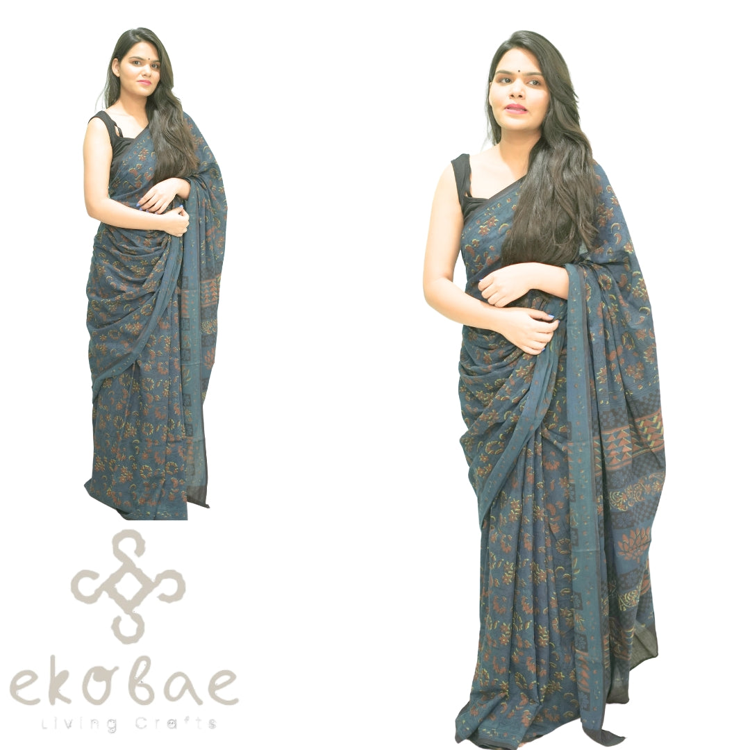 Delicate floral motifs bloom across the saree, adding a touch of whimsy and femininity. The interplay of pure indigo and iron oxide creates a captivating contrast, bringing the floral design to life. Each sari boasts a unique character, with slight variations inherent to the hand-printing process, making it a true work of art.