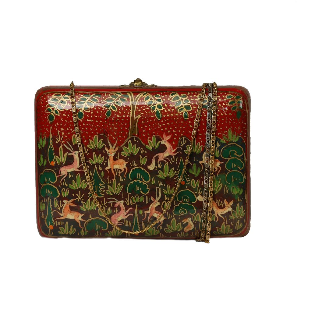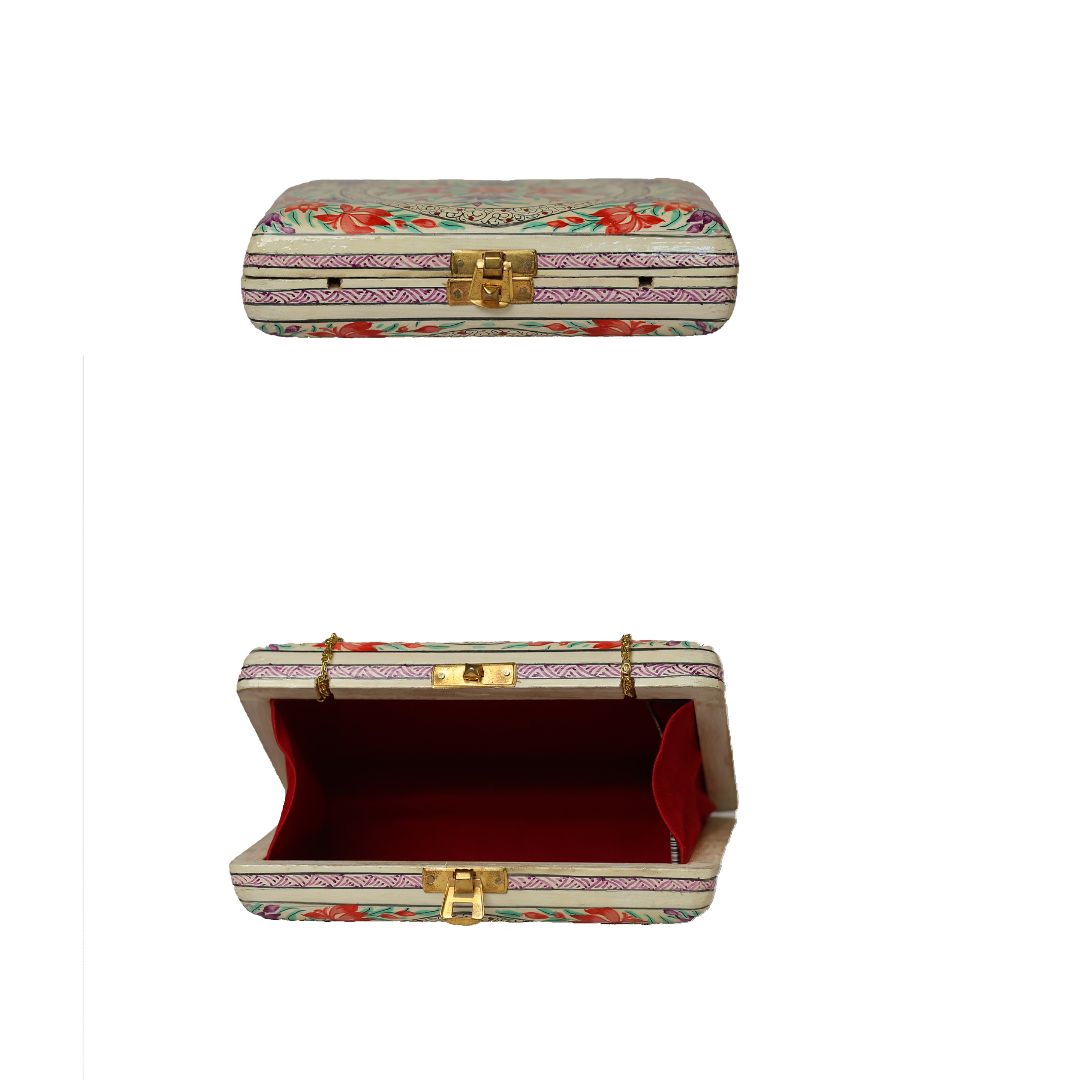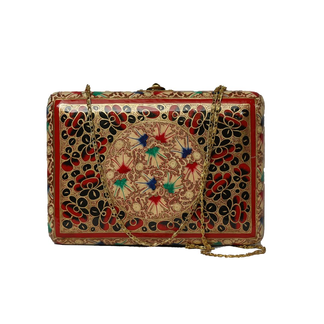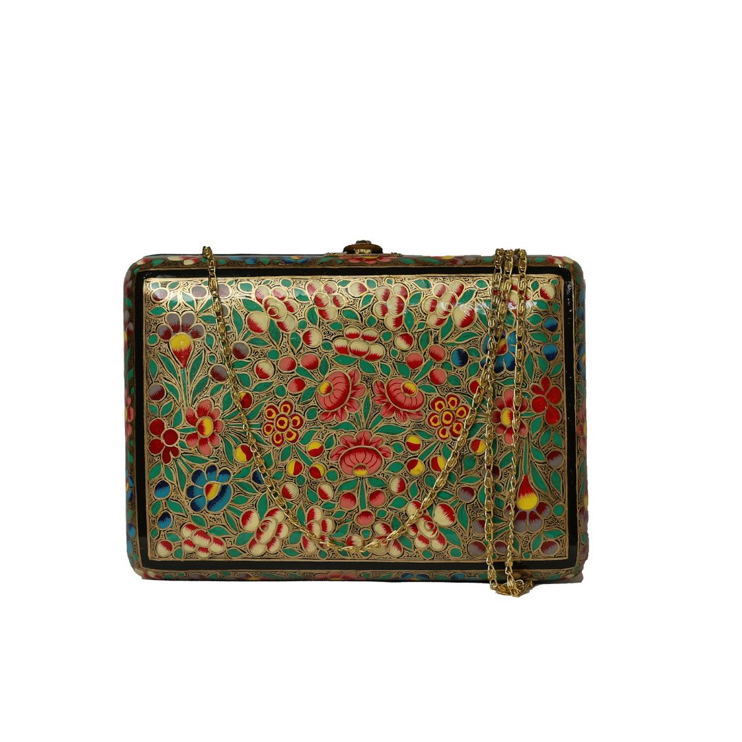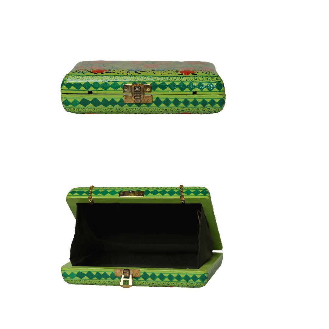 Indulge in sustainable style with the Ekobae Collection's hand-painted wooden clutch. This unique piece embodies slow fashion principles, handcrafted from eco-friendly papier-mache for a truly eco-conscious choice.