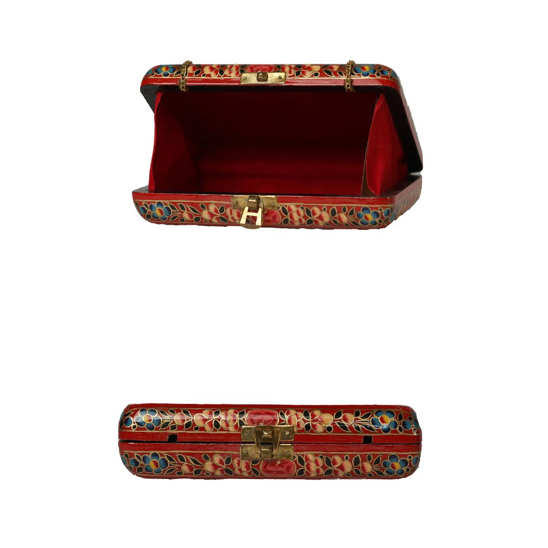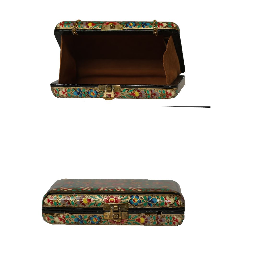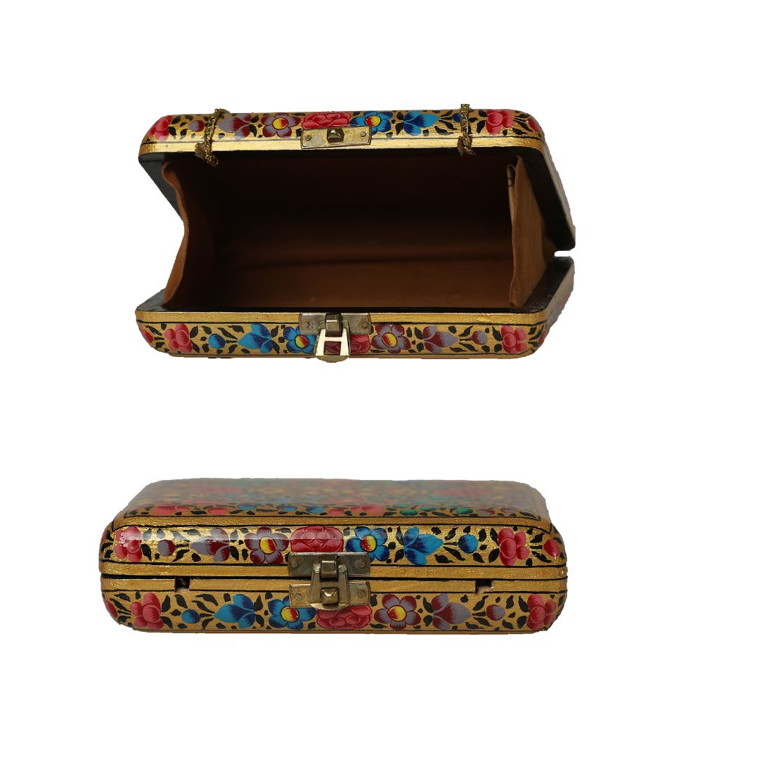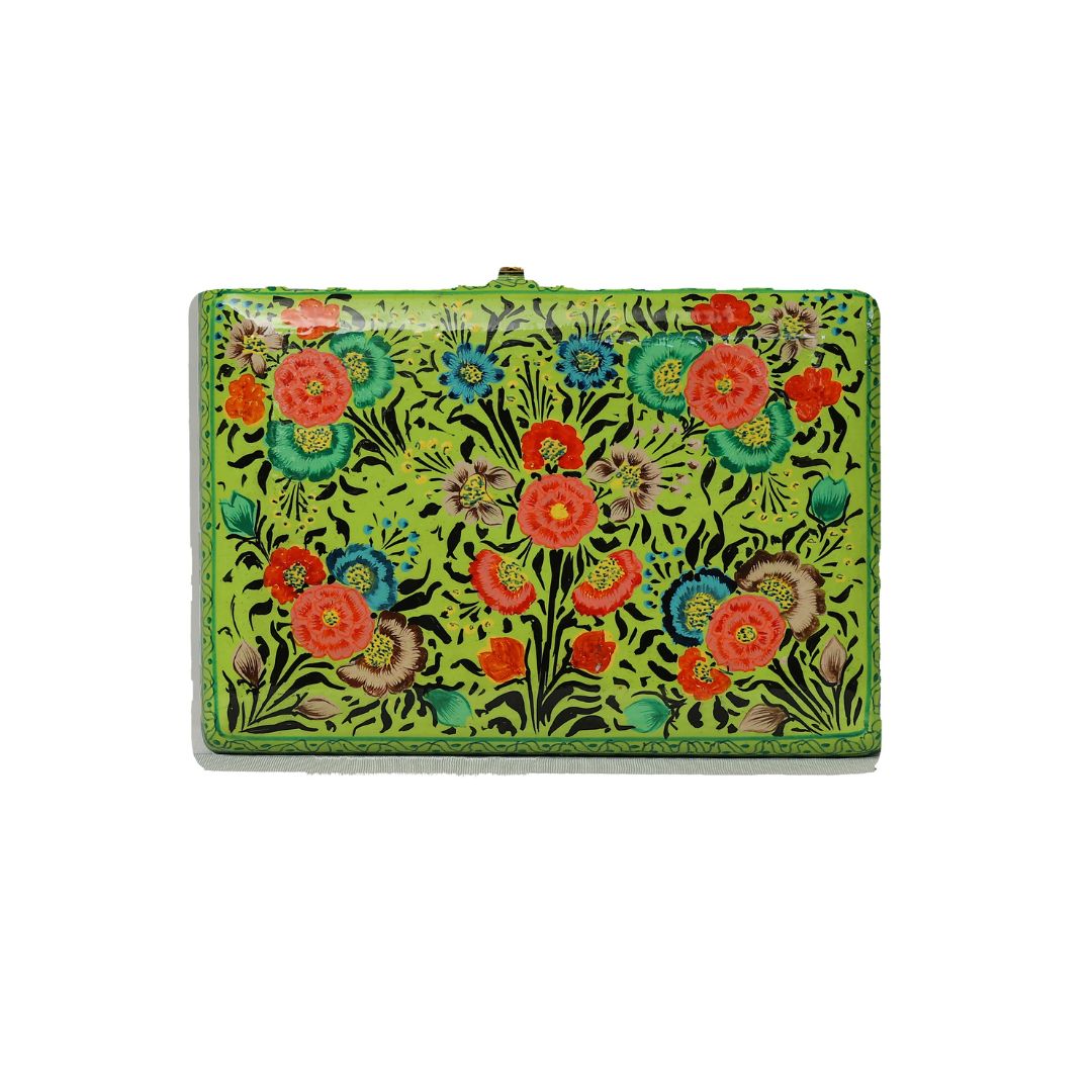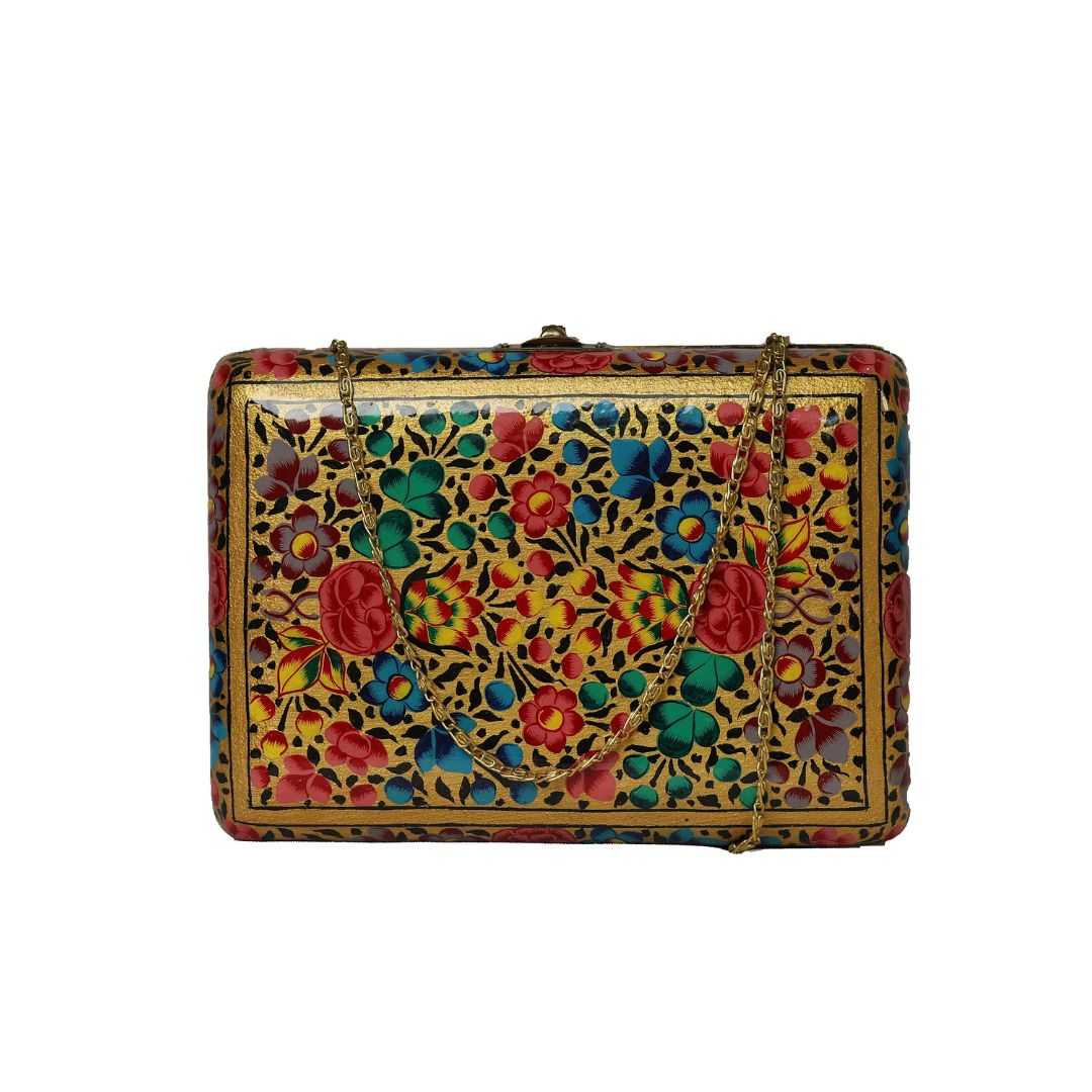 Indulge in sustainable style with the Ekobae Collection's hand-painted wooden clutch. This unique piece embodies slow fashion principles, handcrafted from eco-friendly papier-mache for a truly eco-conscious choice.