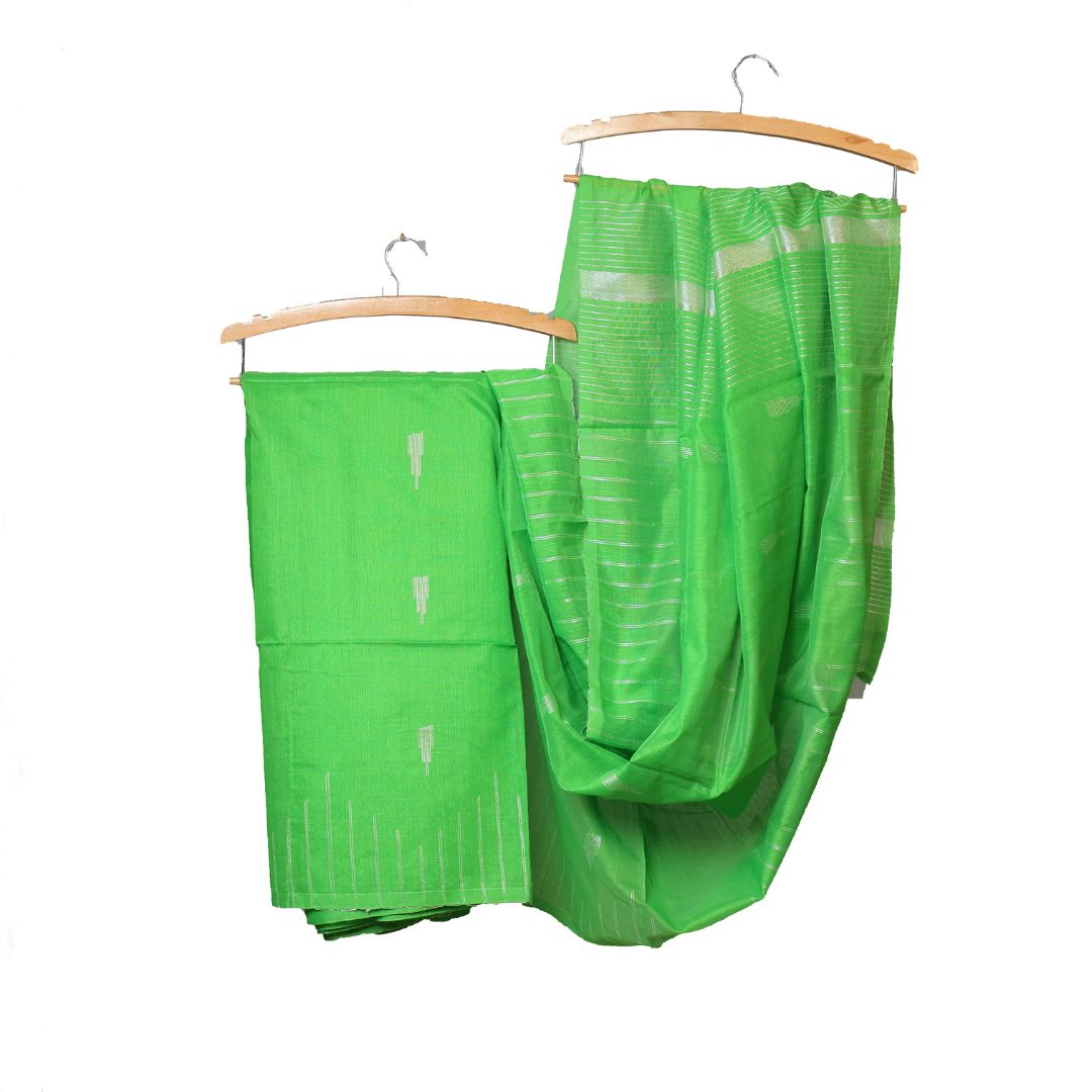 Immerse yourself in a captivating fusion of color and grace with our handloom saree. This exquisite creation boasts a mesmerizing geometric triangle pattern, crafted in various colours. Delicate silver thread accents woven throughout the design add a touch of understated elegance.